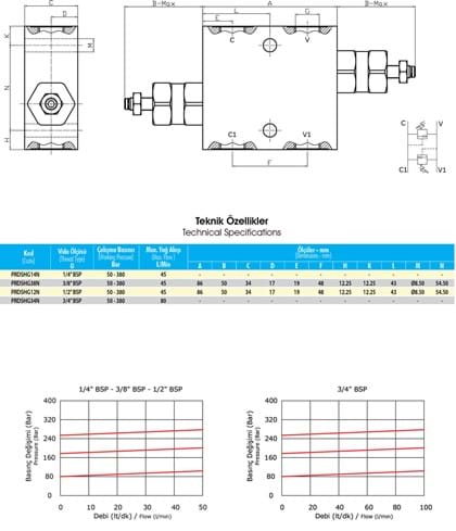 PRD series Hydraulic Double Pressure Relief Valves consist of two safety valves with cross tanks. This valve serves to block the pressure of 2 ports (output) of the hydraulic motor or actuator at a certain setting. It provides ideal protection against sudden pressure shocks. It provides pressure adjustment at 2 ports in the hydraulic circuit separately.