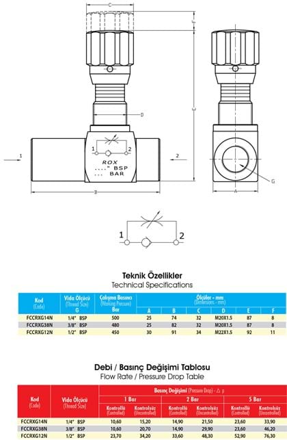 FCCRX Series Hydraulic Flow Control Valves With Check allow shut-off and the adjustment of the flow in both directions. They provide reliable and easy control of fluid by means of the control knob allows adjustment. The setscrew on the control knob allows the knob to be locked, preventing