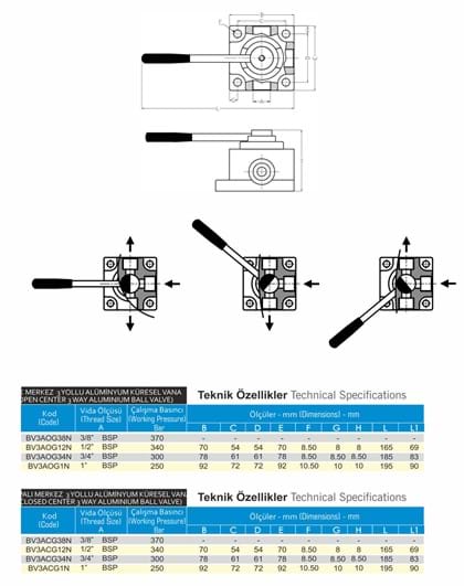 For BV3A Series Hydraulic 3-Way Aluminium Ball Valves, 2 different types, Open Center and Closed Center, are available.