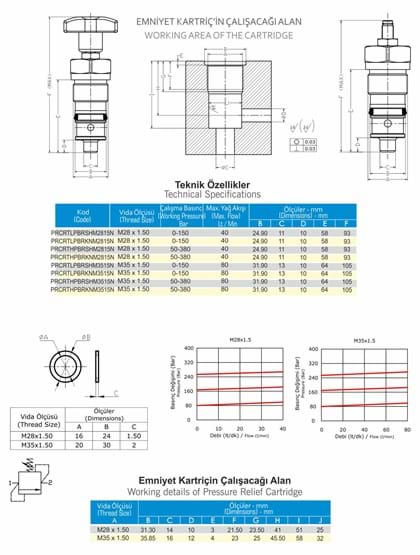 The pressure in the hydraulic system remains on the value determined by the spring on the Pressure Relief Cartridge Valve. PRCRT Series Hydraulic Metric Pressure Relief Cartridge Valves are used to limit the pressure inside of the hydraulic circuits.