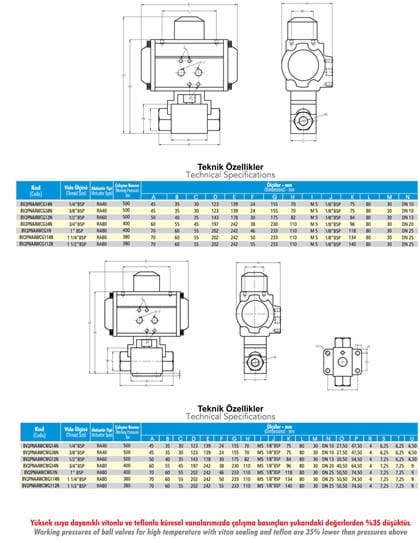 BV2PNA Series Double acting Pneumatic Actuator Hydraulic 2-Way Ball Valves are used to either shut-off or open of flow passage and their easy operation provides unrestricted flow. Due to their volumetric structure they work rapidly and efficiently, and prevent cavitation. BV2PNA Series Double acting Pneumatic Actuator Hydraulic 2-Way Ball Valves can be locked in the open or closed position through locking washer on the circle pin. Internal ball is hard chrome coated steel and delrin (POM) seated. Ball Valves are suitable for LPG, CNG and other gas applications, as well as hydraulic and other industrial fluids. BV2PNA Series Double acting Pneumatic Actuator Hydraulic 2-Way Ball Valves provides the movement with pneumatic actuator instead of handle motion
