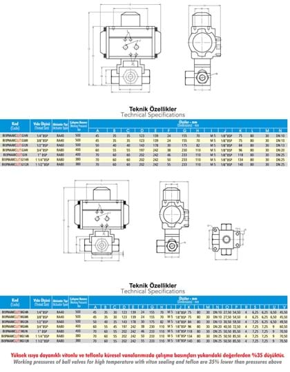BV3PNA Series Double Acting Pneumatic Actuator Hydraulic 3-Way Ball Valves are used to either shut-off or open of flow passage and their easy operation provides unrestricted flow. Due to their volumetric structure they work rapidly and efficiently, and prevent cavitation. BV3PNA Series Double Acting Pneumatic Actuator Hydraulic 3-Way Ball Valves can be locked in the open or closed position through locking washer on the circle pin. Internal ball is hard chrome coated steel and delrin (POM) seated. Ball Valves are suitable for LPG, CNG and other gas applications, as well as hydraulic and other industrial fluids. BV3PNA Series Double Acting Pneumatic Actuator Hydraulic 3-Way Ball Valves provides the movement with pneumatic actuator instead of handle motion