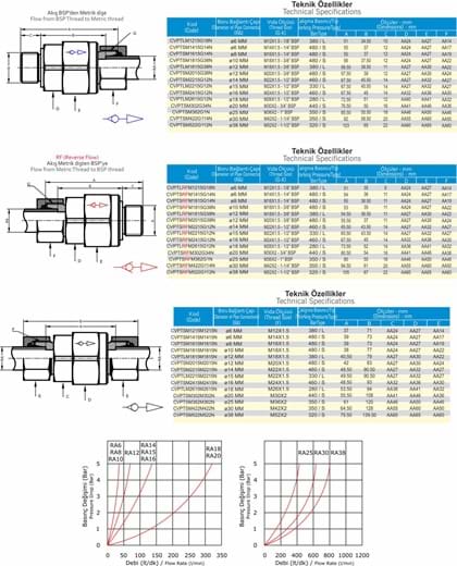 CVPT Serisi Hidrolik Boru Bağlantı Tipi Çek Valfler, hidrolik akışkanın hat boyunca sadece tek yönde akmasına izin veren iki yollu valf çeşididirler. Kısma noktalarının baypasında, akışkanın bir yönde engellenmesinde, tanka tahliye valfi olarak ve devrelerde belirli bir karşı basınç üretilmesi için ön gerilim (tutma) valfi olarak kullanılmaktadır. CVPT Serisi Boru Bağlantı Tipi Çekvalfler, otomatik rekor kullanımına gerek kalmaksızın çekvalfe bağlantı imkanı sağlar.