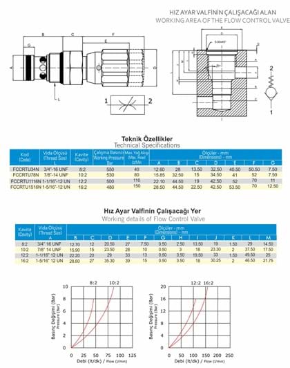 FCCRT serisi Kartriç Tip Hız ayar valfi akışkanın hızının her iki yönde çok hassas şekilde ayarlanmasını sağlayan valf türüdür. Kartriç tip hız ayar valfleri ayar yapmaya yarayan kontrol kapağında kapağı kilitleyerek titreşimden kaynaklanan oynamaları ve değişimleri engelleyen bir ayar vidası bulunmaktadır. Akışkanın gücünü hassas şekilde koruyup kontrol eden ve kusursuz hız ayarını sağlayan FCCRT serisi Kartriç tip hız ayar valfleri özellikle mobil ve endüstriyel hidrolik uygulamalar ve kaldırma platformları başta olmak üzere tüm sanayide yaygın şekilde kullanılmaktadır.