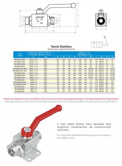 BV2M Serisi Hidrolik 2 Yollu Metrik Küresel Vanalar hidrolik ve diğer sanayi yağlarının yanı sıra akaryakıt, LPG, CNG ve diğer gaz geçişlerinde de kullanılırlar.