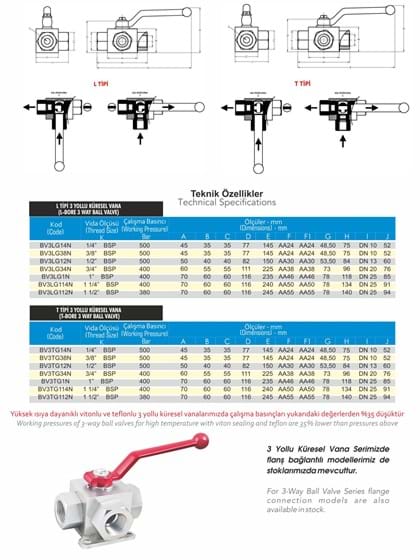 BV3 Serisi Hidrolik 3 Yollu Küresel Vanalar, L-Tipi ve T-Tipi olarak iki farklı tipte mevcuttur. 3 yollu vanalar bir yönden gelen akışkanın diğer iki yöne geçişinde kullanılırlar. Kolayca açılıp kapanabilmeleri akışkan geçişinin rahat olmasını sağlar.