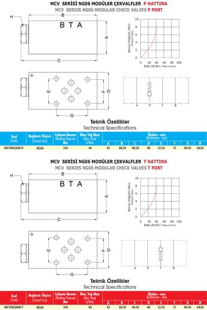 NG06 modüler çekvalfler hidrolik akışkanın hat boyunca sadece tek yönde geçişini veren valf çeşididir. NG06 modüler çekvalfler, valfleri pleyt üzerine bağlantı ile diğer valfler uyumlu çalışmaktadır. NG06 modüler çekvalfler mobil ve diğer sanayi alanlarında geniş kapsamda kullanılmaktadır.