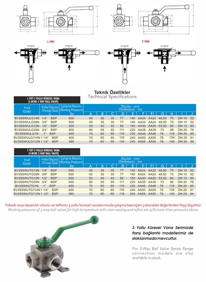 Komple olarak AISI 316-L paslanmaz çelikten imal edilen BV3SS Serisi Hidrolik 3 Yollu AISI 316-L Paslanmaz Küresel Vanalar, her türlü kimyasal ve korozyona karşı mükemmel dirence sahiptir.