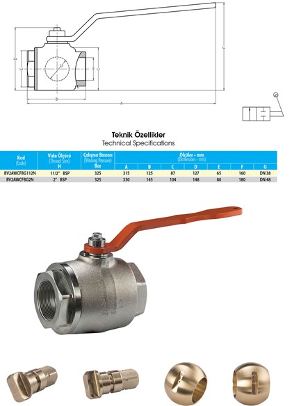 İstenildiğinde kare pim üzerindeki kilitleme pulu yardımıyla açık veya kapalı olarak kilitlenebilirler. BV2AWCFB Serisi 2 yollu tam geçişli küresel vanalarda (su & hava ve bazı özel kimyasallar) içteki küre malzemesi pirinçten olup, sert krom ile kaplanmıştır. BV2AWCFB Serisi 2 yollu tam geçişli küresel vanalarda (su & hava ve bazı özel kimyasallar)su ve hava hatlarında, bazı özel kimyasal akışkanların geçişinde kullanılırlar.